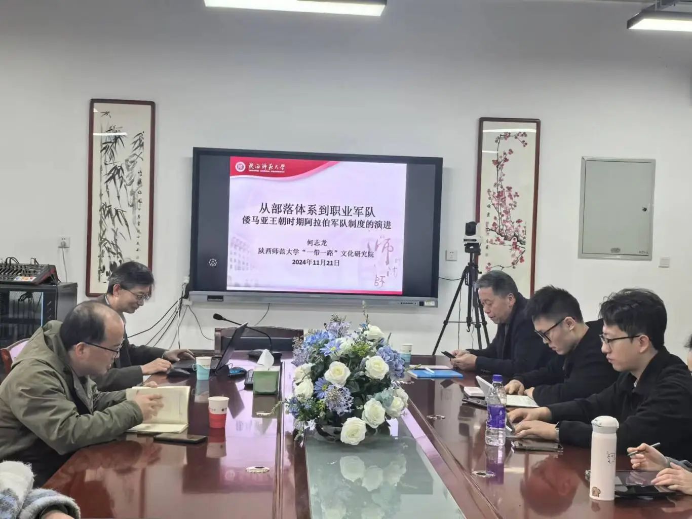 2024年11月22日上午,陕西师范大学“一带一路”文化研究院执行院长何志龙教授作客yl6809永利集团中东研究所,主讲yl6809永利集团中东高端讲座第33讲,题目为“从部落体系到职业军队:倭马亚王朝时期阿拉伯军队制度的演进”。讲座由yl6809永利集团中东研究所王猛教授主持,中东所多名师生参加。