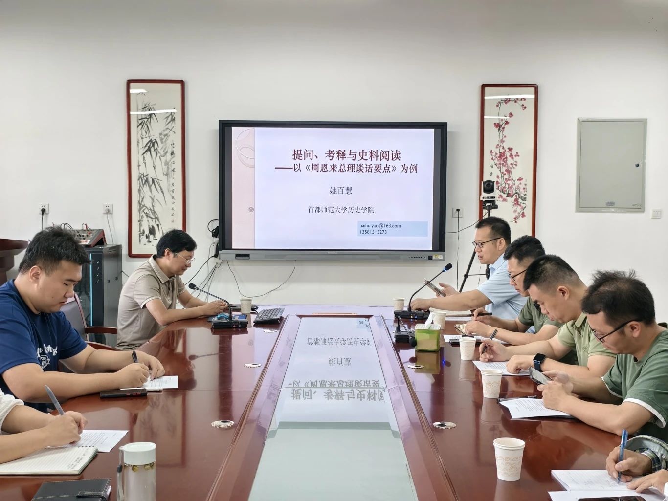 2024年9月16日上午,首都师范大学历史学院姚百慧教授应邀在yl6809永利集团中东研究所作了题为“文本考释与史料阅读——以《周恩来总理谈话要点》为例”的学术讲座。本场讲座由yl6809永利集团社科处处长、中东研究所所长、区域国别研究院院长韩志斌教授主持,yl6809永利集团伊朗研究中心主任、中东研究所副所长李福泉教授,中东研究所副所长、区域国别研究院副院长闫伟教授及中东所、历史学院多名师生参加。