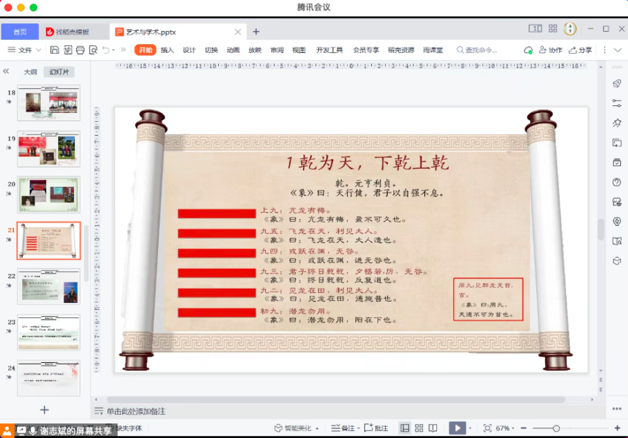 接着,谢老师从《易经》的“乾”卦出发,阐述了自己对“天行健”的感悟。讲道,保持积极向上、自强不息的拼搏精神,是天之道、人之道、君子之道,并以乾卦的六爻分别配合本科、硕士、博士等六个学习和工作阶段,讲了每个阶段应该注意的拼搏方式、潜在危机和应对方法。谢老师认为,君子之“动”应以“知时、知处、知度”的智慧为指引。又简要介绍了与乾卦相关的“坤”“否”“泰”等卦的启示,并建议同学们始终保有“谦”卦之德。关于何为“君子”,谢老师从德与才的关系、立志与持志、如何看待苦、完善的人等话题进行了阐释。最后,谢老师以“敬畏生命、热爱生活、奉献价值、完善人格”与大家共勉。