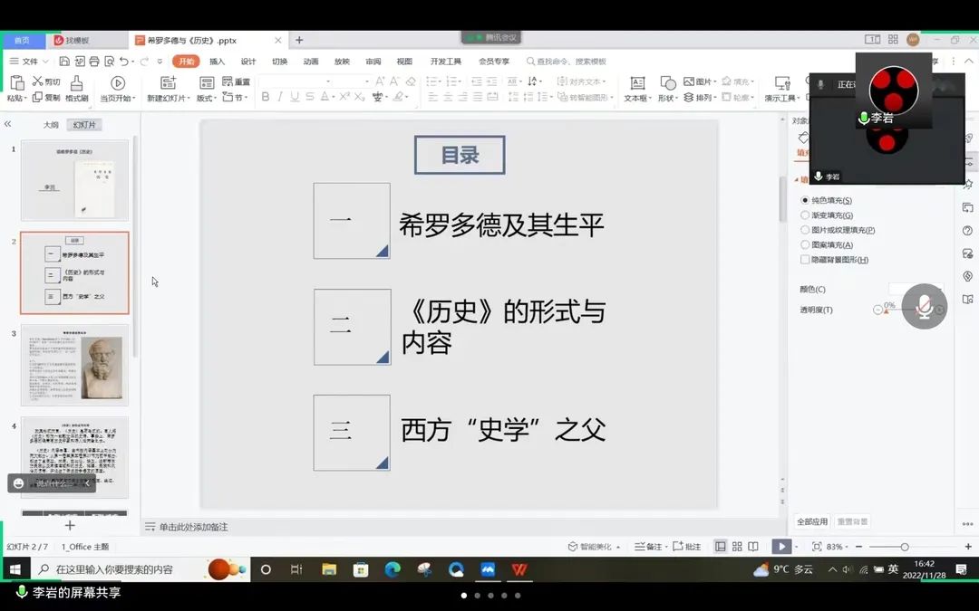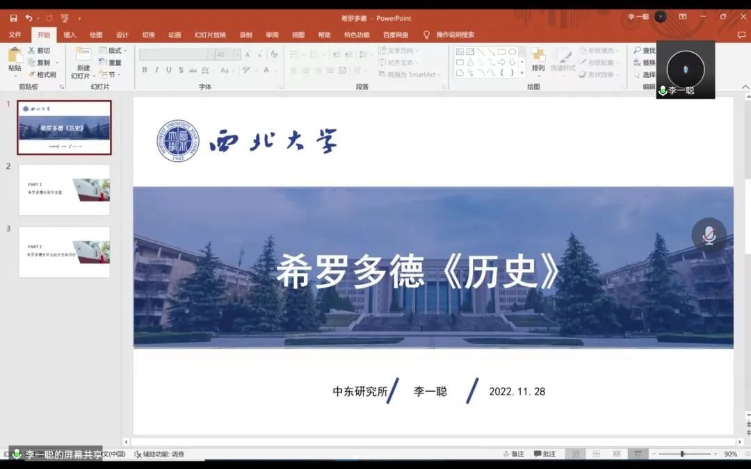 硕士生李一聪从希罗多德的写作主题、波希战争的起止时间和希罗多德的史学成就三方面对希罗多德及其史学著作《历史》进行了介绍。硕士生李岩从希罗多德及其生平、《历史》的结构与内容和“西方史学之父”的学术评价三方面分别展开分享。