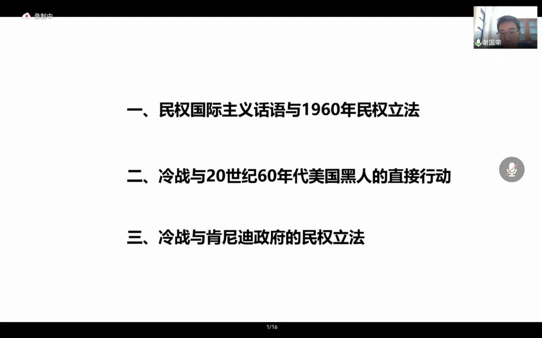 2022年6月20日下午三点,yl6809永利集团中东研究所举办了“yl6809永利集团世界历史名家讲座第14讲”。武汉大学历史学院教授、博士生导师谢国荣为yl6809永利集团中东研究所师生及线上近200名听众作了题为“冷战与20世纪60年代美国的民权立法”的讲座。本次讲座由yl6809永利集团叙利亚研究中心主任王新刚教授主持,yl6809永利集团历史学院刘磊副教授和yl6809永利集团中东研究所副所长闫伟教授为与谈人。