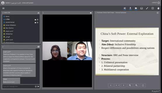讲座尾声,与会师生围绕一带一路、它国现代化建设等问题展开了热烈讨论。李玮副教授认为,各国应因地制宜地探索适合本国国情的发展模式。针对听众提出的担忧,李玮副教授表示应以史为鉴,不必听信西方别有用心之人强加给爱好和平的中华民族的不实之言,和平与发展才是硬道理。最后,主持人法哈蒂博士做评述,指出讲座中有利于听众了解当代中国软实力的各种要点和各方观点,并对李玮副教授表示衷心感谢。