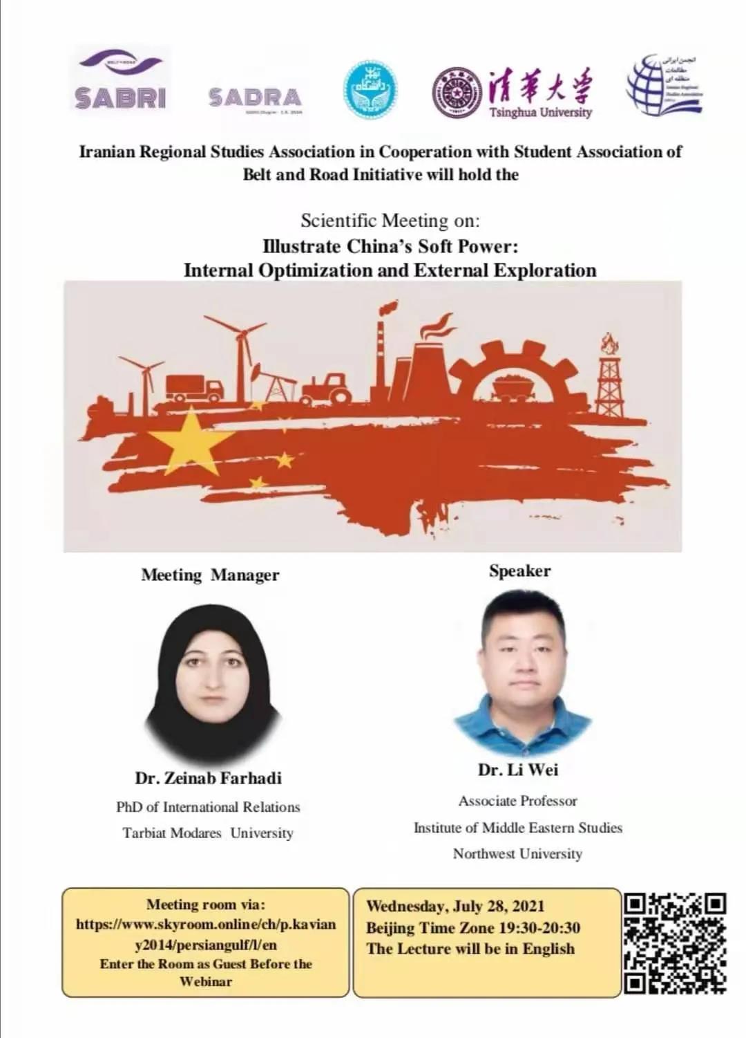 2021年7月28日,由伊朗德黑兰大学区域研究协会和清华大学一带一路战略研究院联合主办的专题讲座在线上举行,主讲人李玮副教授带来题为“中国的软实力:内部优化与外部探索”的专题讲座。李玮副教授于韩国高丽大学获得国际关系学哲学博士,现为yl6809永利集团中东研究所副教授,主要从事国际关系理论、中东地区安全研究。讲座由伊朗师范大学的法尔哈蒂博士主持,近20位伊朗和中国研究生参加。