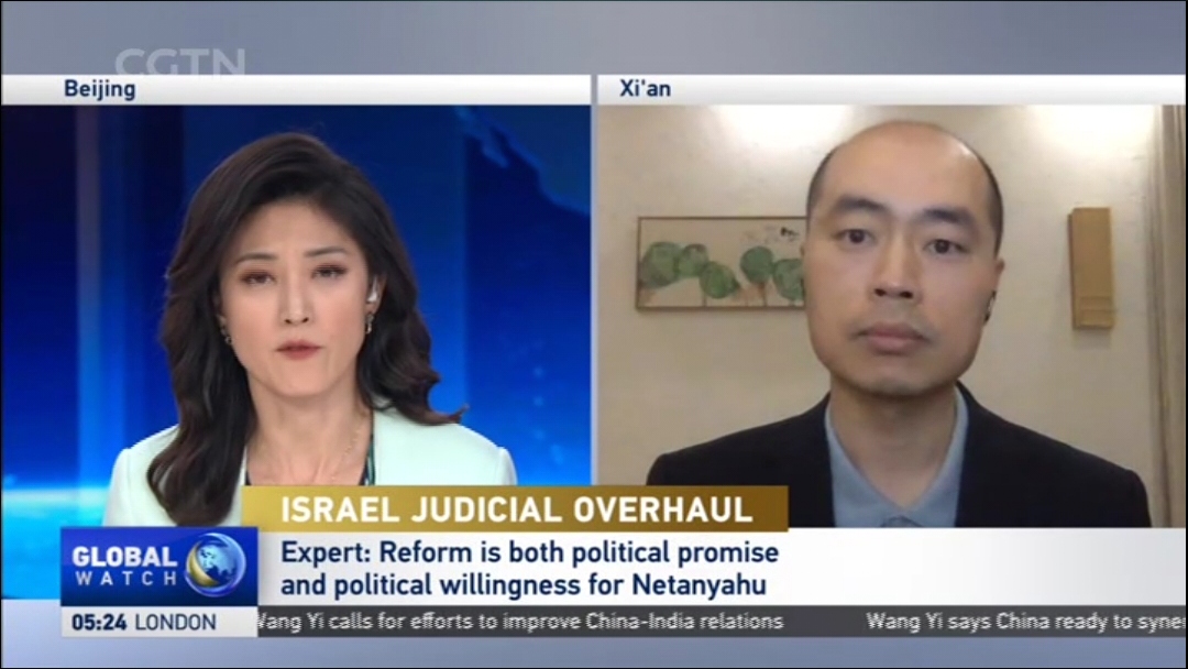 2023年7月25日,中东研究所副教授王晋就以色列司法改革,接受了中央电视台英语频道(CGTN)“环球瞭望”节目的采访。