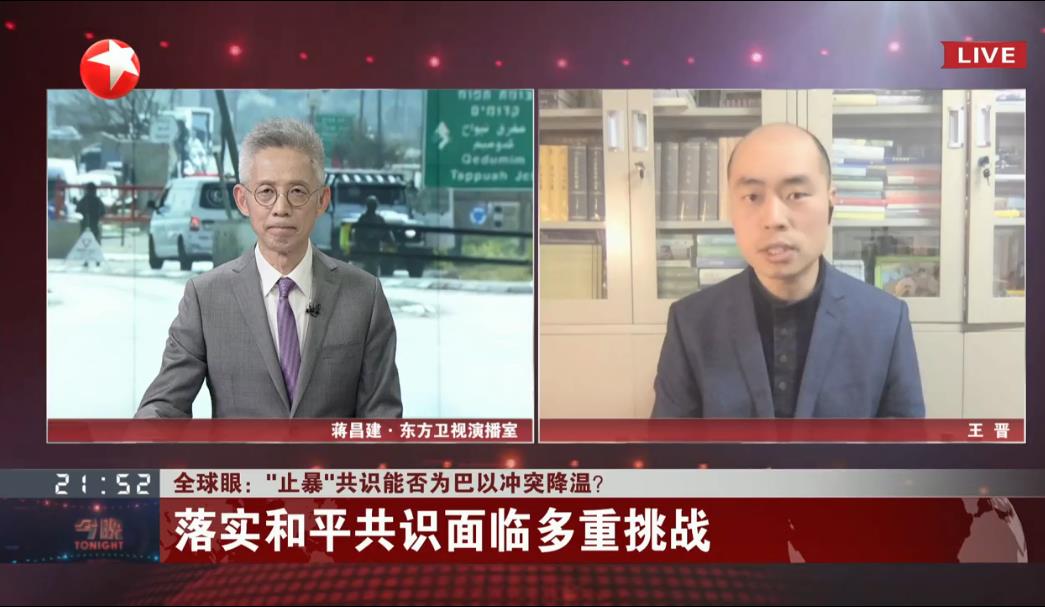 日,中东研究所副教授王晋就巴以问题,接受了东方卫视“今晚”的采访。王晋认为,在约旦斡旋的巴以和平临时机制,将有助于巴以冲突降温,但是未来冲突重燃的可能性仍然较大。