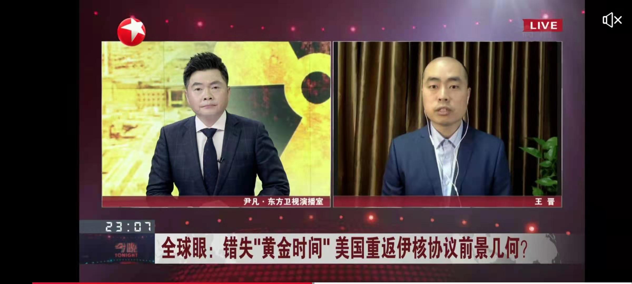 2021年4月2日,王晋副教授就美国和伊朗关系,接受了东方卫视《今晚》节目的采访。王晋认为,2021年4月-6月将是美国和伊朗对话的关键时期,美国和伊朗尽管口径强硬,但是很可能会在未来一段时间做出让步,妥善解决核问题。