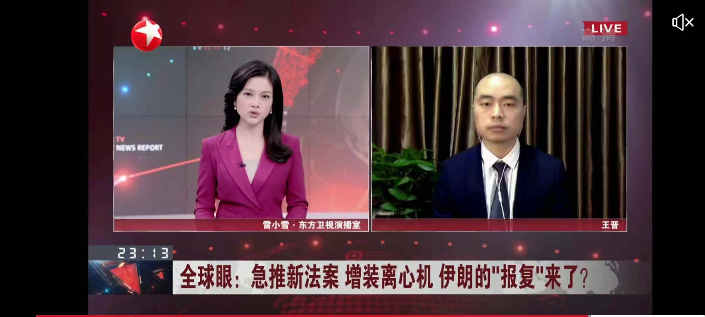 2020年12月4日,中东研究所副教授王晋就伊朗核问题,接受了东方卫视《今晚》节目的采访。王晋认为,伊朗议会通过新的法案,旨在加速核研发进程,将使得伊朗核问题愈发敏感和激烈。未来美国拜登政府和伊朗的对话,也将因此面临新的障碍。