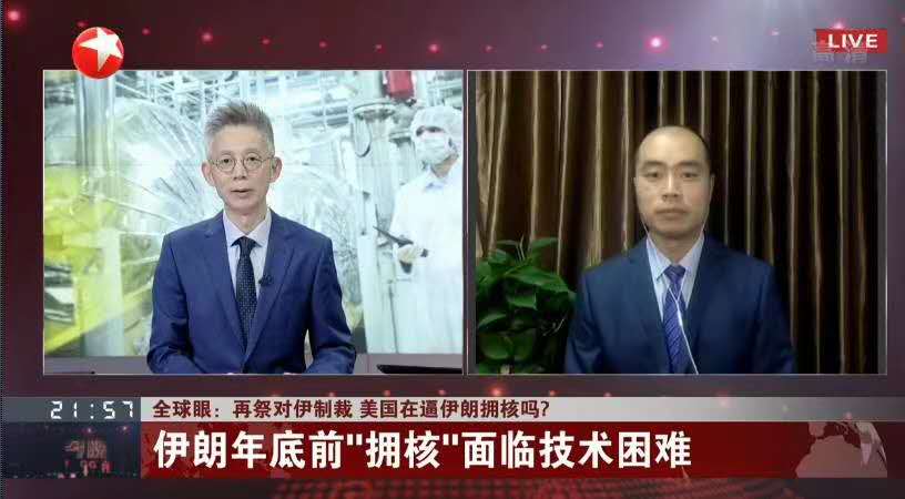 2020年9月21日,中心研究员王晋就美国伊朗关系,接受了东方卫视《今晚》节目的采访。王晋认为,伊朗尽管已经突破了浓缩铀丰度和当量的限制,但是在年底之前制造出核武器,仍然面临很大的技术难度,几乎是一项不可能完成的任务。