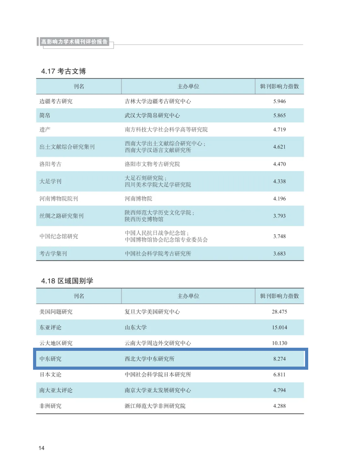 近日,中国知网在京召开2024年度知网学术影响力评价系列报告发布会,会上发布《高影响力学术辑刊评价报告(2024)》等6项评价报告。《中东研究》入选区域国别学科领域“2024年度高影响力学术辑刊”。