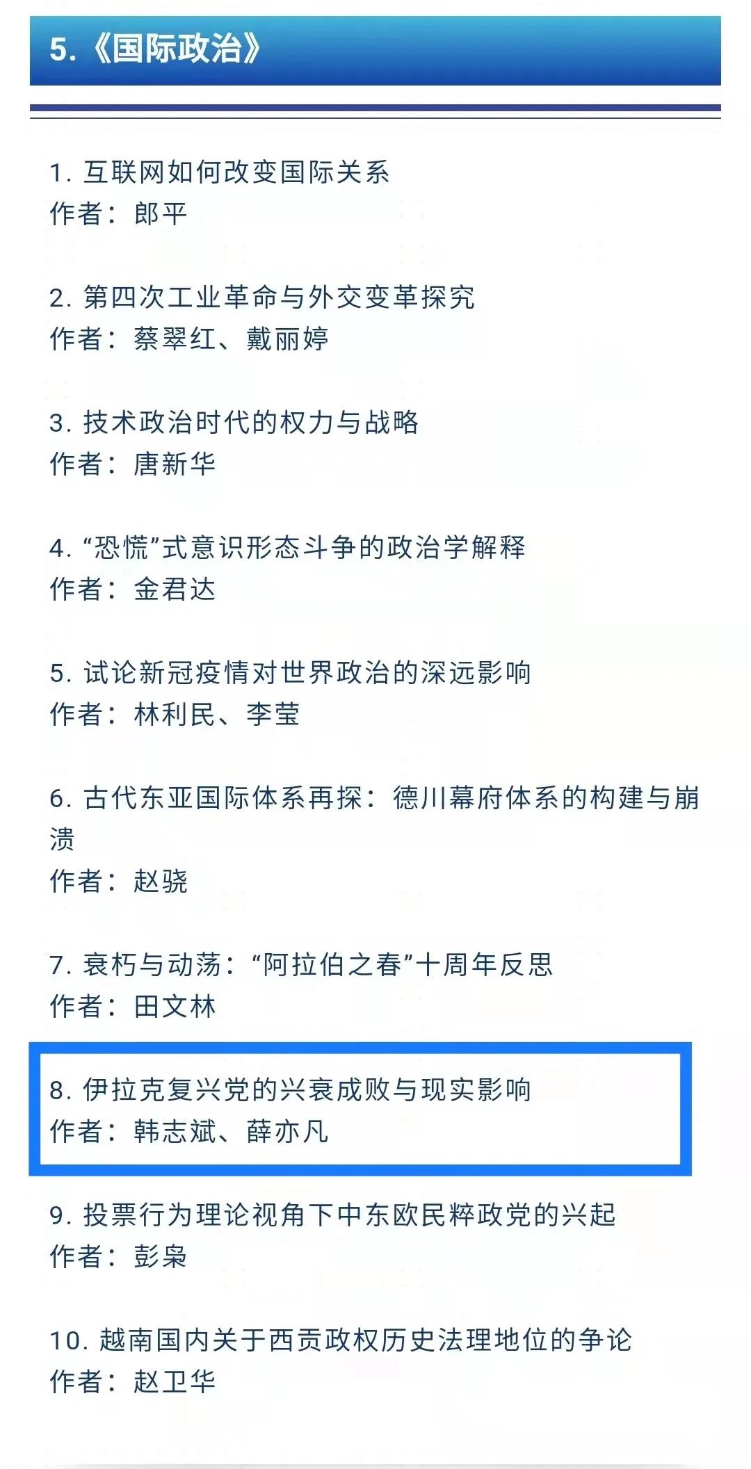yl6809永利集团中东研究所韩志斌教授与博士生薛亦凡所写的论文《伊拉克复兴党的兴衰成败与现实影响》文章被人大复印资料2021年第9期全文转载。该文发表于《西亚非洲》2021年第3期。