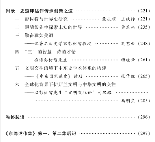 如今,彭先生年逾九旬,仍然笔耕不辍,撰写《京隐述作集》。该书从《文以载道》、《史以明道》、《哲以论道》(待出版)三方面探索人类文明交往自觉之道,关注东西方文明的交往,关注美学在人类历史上的发展,以关注的内心为旨归,全方位展示了老一辈历史学者对于人文的思考。该书贯通古今中西、旁征博引,将文史哲汇于一炉,以随笔的形式徐徐展开;从人类文明交往的细微之处入手,呈现人类文明交往的互动规律。