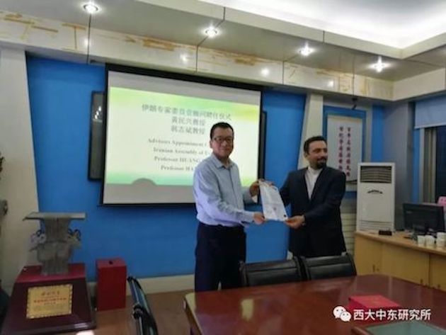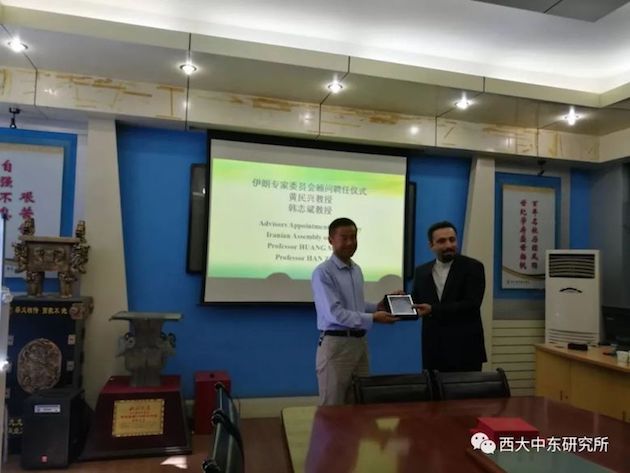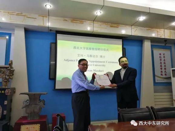 会上,yl6809永利集团中东所聘任伊朗专家委员会主席伊玛·马斯达里(Iman Masdari)博士为yl6809永利集团客座教授,黄民兴教授向马斯达里博士颁发了yl6809永利集团客座教授聘书。同时,马斯达里教授也代表伊方机构聘中东研究所黄民兴教授和韩志斌教授为伊朗专家委员会外籍专家。