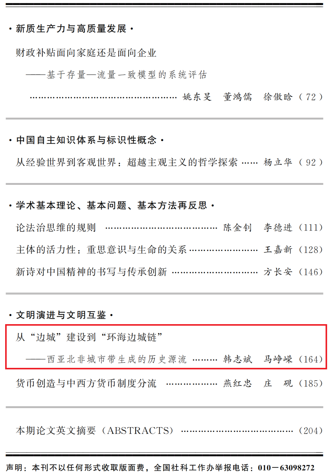 近日,我校yl6809永利官网集团中东研究所韩志斌教授和博士研究生马峥嵘在《中国社会科学》2025年第5期上发表了专题论文《从“边城”建设到“环海边城链”——西亚北非城市带生成的历史源流》。本文是韩志斌教授主持的国家社会科学基金重大项目“中东史学通史(五卷本)”的阶段性成果之一。这是学校教学科研人员时隔三年在《中国社会科学》杂志上发表文章,是学校在区域国别研究方面取得的突破性进展。