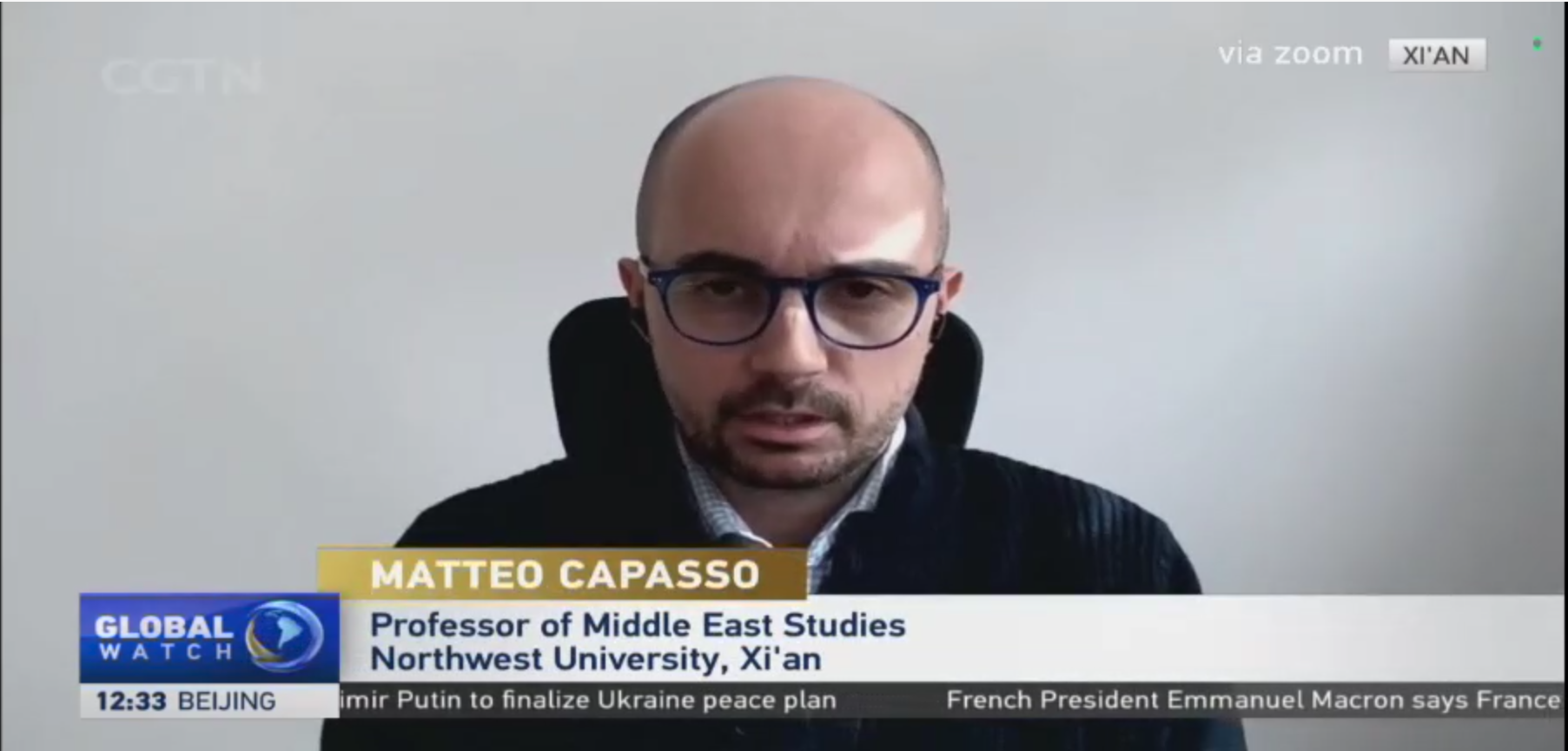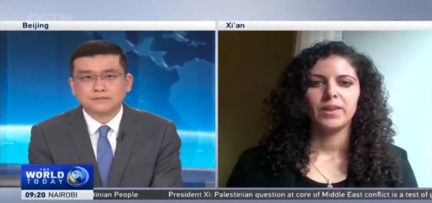 近日,yl6809永利官网集团教师马韬(Matteo Capasso)和婉澜(Walaa Alqaisiya)就习近平主席在“声援巴勒斯坦人民国际日”最近声明接受中国国际电视台(CGTN)《全球观察》节目采访。