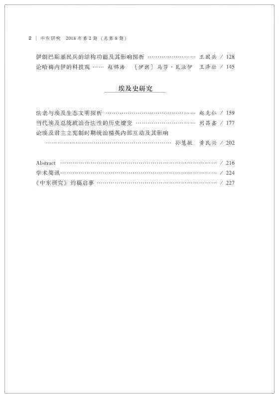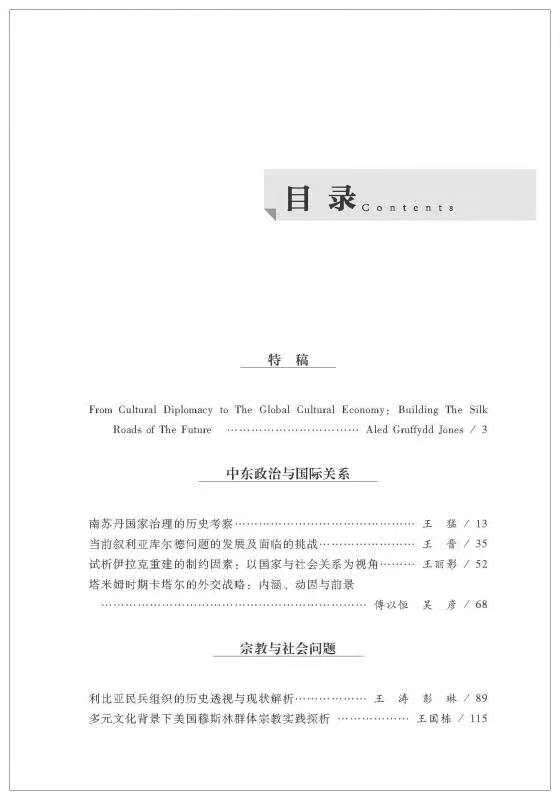 《中东研究》2018年第2期共刊发12篇专题性研究论文,涉及中东政治与国际关系、宗教与社会问题、埃及史研究三个方面。在中东政治与国际关系方面,王猛就南苏丹国家治理进行了历史考察;王晋对当前叙利亚库尔德问题的发展进行了深入研究;王丽影以国家与社会关系为视角分析了伊拉克重建的制约因素;傅以恒、吴彦则深入研究了塔米姆时期卡塔尔的外交战略。在宗教与社会问题方面,王涛、彭琳深入研究了利比亚民兵组织;王国栋探析了多元文化背景下美国穆斯林群体;王国兵对伊朗巴斯基民兵的结构功能及其影响进行了分析;赵锦浩、(伊朗)马莎·瓦法伊、王泽壮就哈梅内伊的科技观进行了论述。在埃及史研究方面,赵克仁分析了法老与埃及生态文明;刘昌鑫对当代埃及总统政治合法性的历史嬗变进行了深入研究;孙慧敏、黄民兴论述了埃及君主立宪制时期统治精英内部互动及其影响。另外,本期特稿为Aled Gruffydd Jones的“From Cultural Diplomacy to The Global Economy: Building The Silk Roads of The Future”。《中东研究》欢迎国内外学者惠赐佳作!