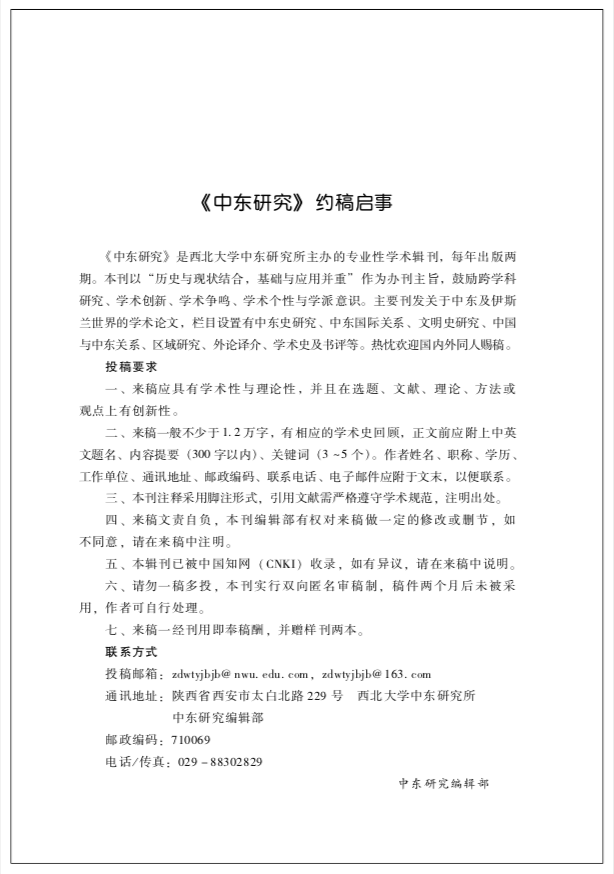 《中东研究》是yl6809永利集团中东研究所主办的专业性学术期刊,该刊每年出版两辑,在2018年人文社会科学集刊年会上被评为优秀集刊。本刊以“历史与现状结合;基础与应用结合”作为办刊主旨,鼓励跨学科研究、学术创新、学术争鸣、学术个性与学派意识。主要刊发关于中东及伊斯兰世界的学术论文,栏目设置有中东史研究、中东国际关系、文明史研究、中国与中东关系、区域研究、外论译介、学术史及书评等。中东研究所聘请国内中东研究领域的知名专家学者担任编委,加强与国内外学界的交流与联系。《中东研究》不仅为中东研究所提供了学术交流与宣传的媒介,也为我国中东问题研究搭建一个良好的学术交流平台,同时有助于促进中国中东研究的发展和学术新秀的成长。