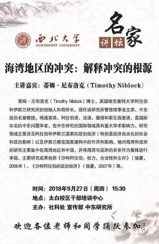 2018年9月27日,中东研究所将在太白校区干部培训中心(生命科学学院学院楼一楼)举办名家讲坛。蒂姆·尼布洛克(Timothy Niblock)教授将带来题为“海湾地区的冲突:解释冲突的根源”(Conflict in the Gulf: Explaining the Roots of Conflict)的学术讲座。详细情况如下: