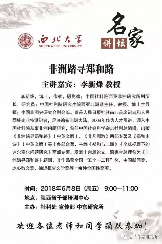 2018年6月8日,中东研究所将于yl6809永利集团干部培训中心举办中国社会科学院西亚非洲研究所副所长李新烽教授的学术讲座:《非洲踏寻郑和路》,详细情况如下: