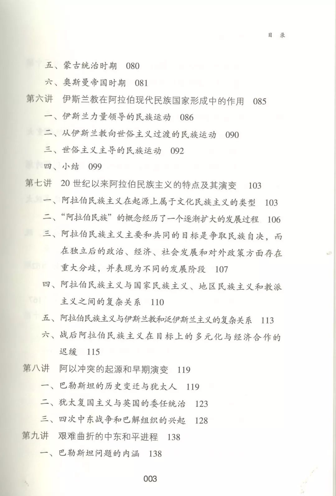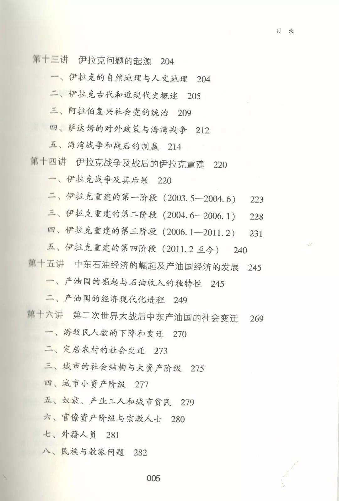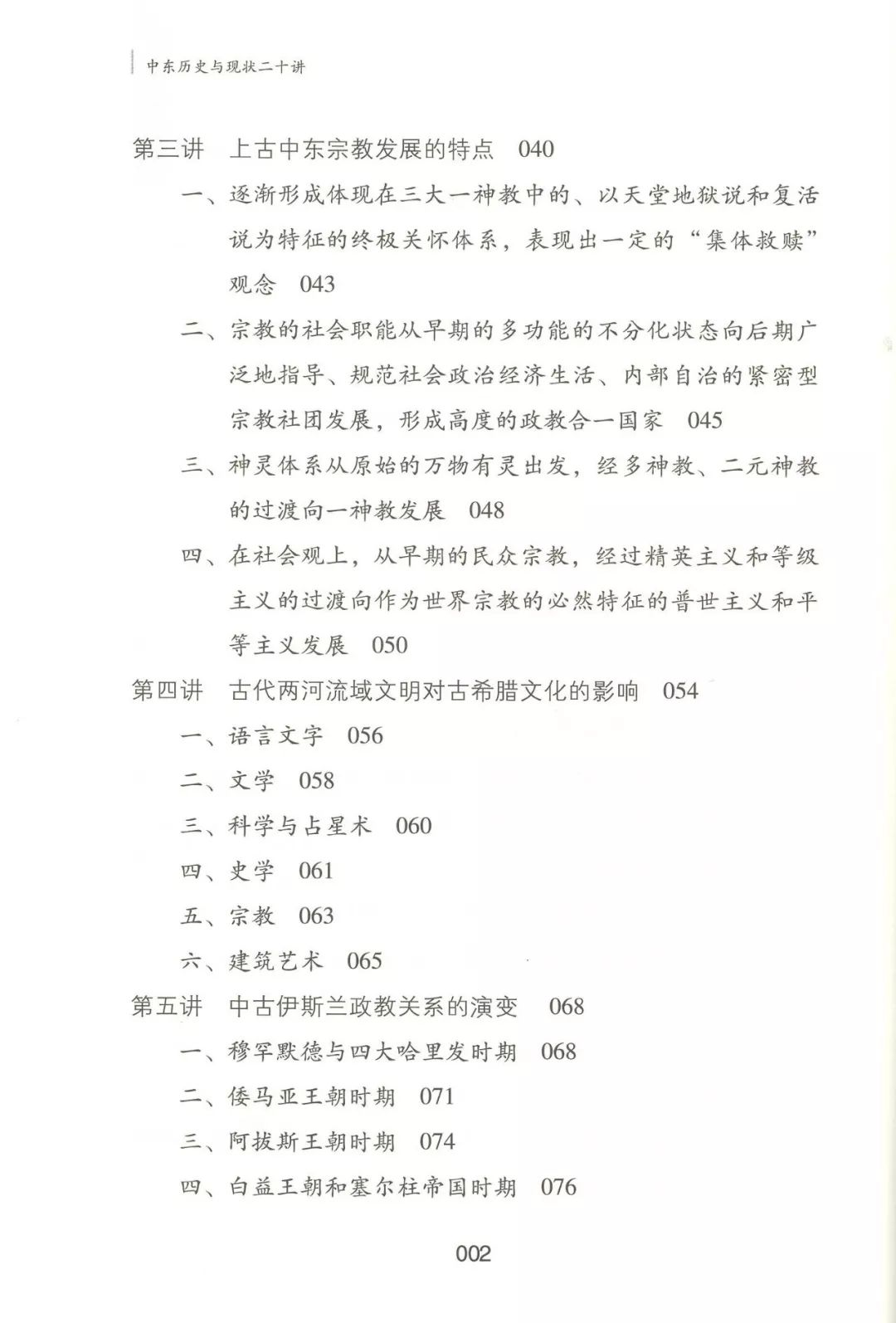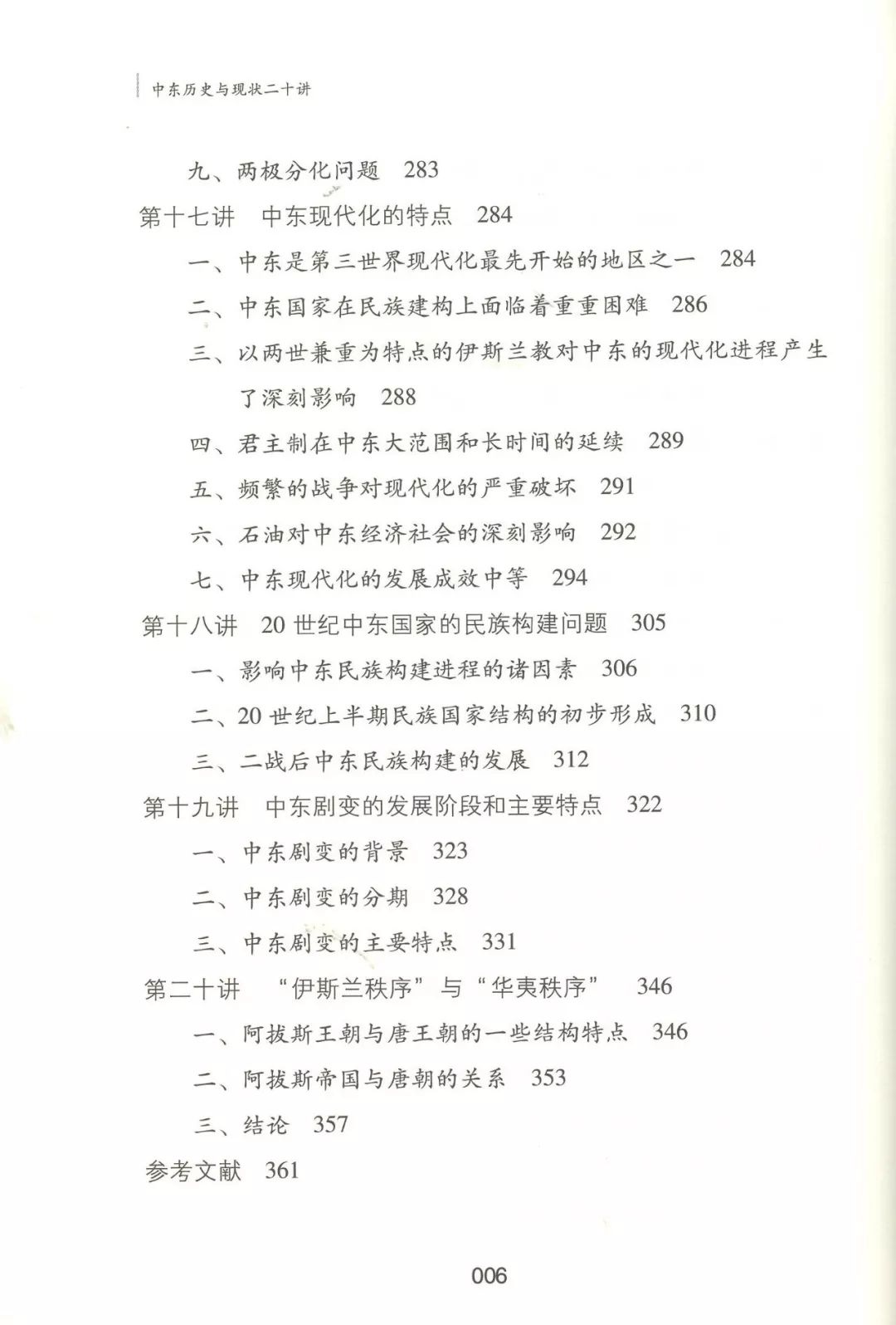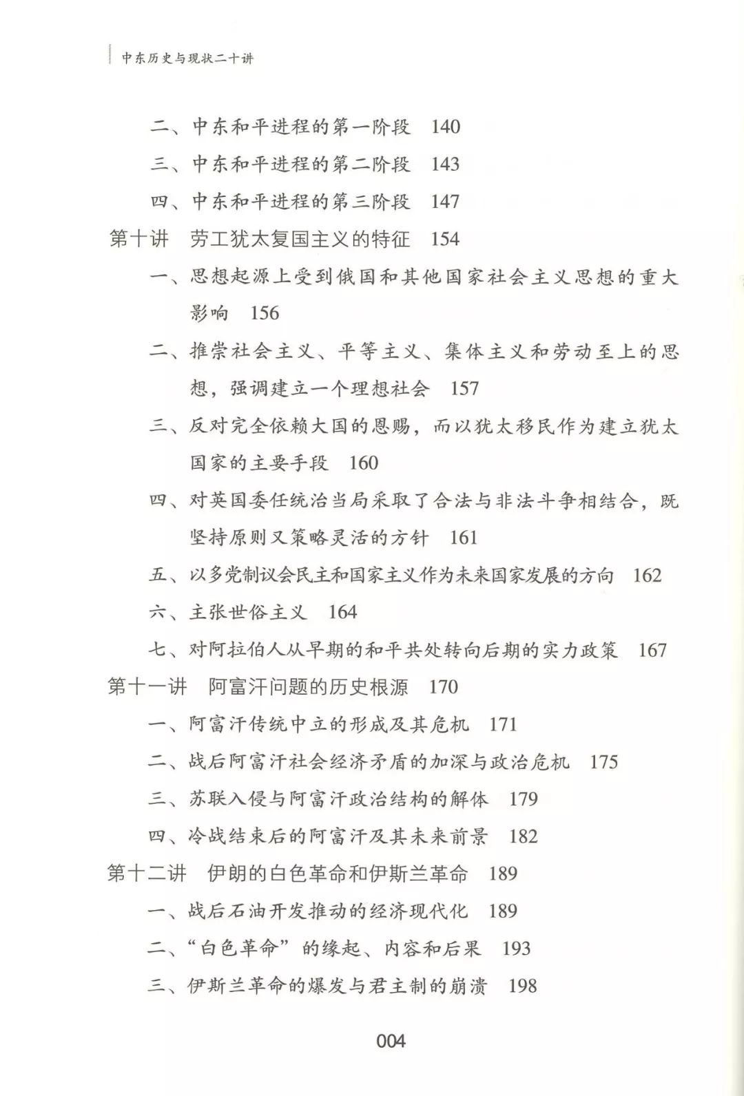本书的具体内容包括:上古中东宗教发展的特点、古代两河流域文明对古希腊文化的影响、中古伊斯兰政教关系的演变、伊斯兰教在阿拉伯现代民族国家形成中的作用、20世纪以来阿拉伯民族主义的特点及其演变、阿以冲突的起源和早期演变、艰难曲折的中东和平进程、劳工犹太复国主义的特征、阿富汗问题的历史根源、伊朗的白色革命和伊斯兰革命、伊拉克问题的起源、伊拉克战争及战后的伊拉克重建、中东石油经济的崛起及产油国经济的发展、第二次世界大战后中东产油国的社会变迁、中东现代化的特点、20世纪中东国家的民族构建问题、中东剧变的发展阶段和主要特点、“伊斯兰秩序”和“华夷秩序”。