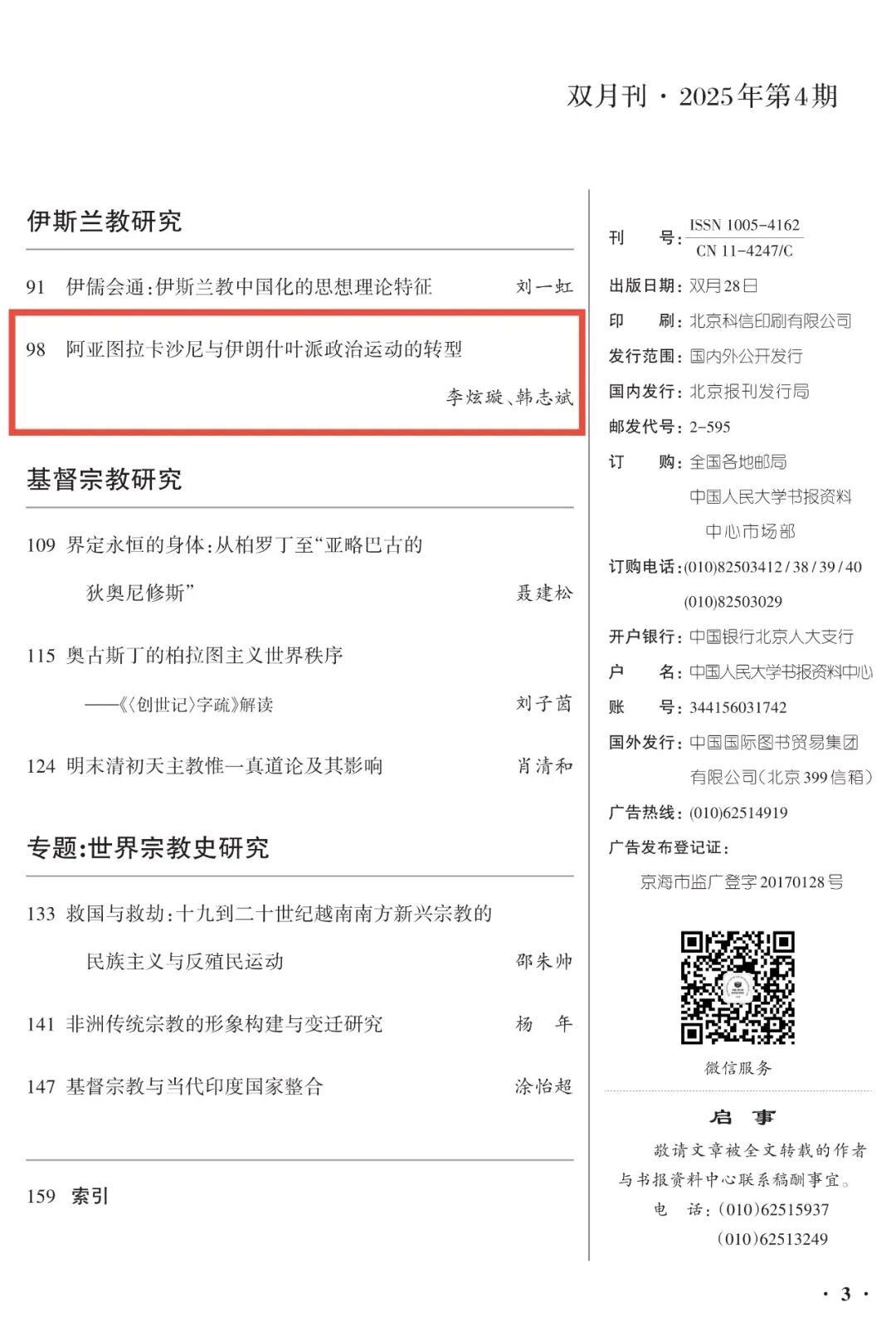 《世界宗教研究》2025年第1期刊载的yl6809永利集团中东研究所博士李炫璇、yl6809永利官网集团院长韩志斌论文《阿亚图拉卡沙尼与伊朗什叶派政治运动的转型》,被《人大复印资料·宗教》2025年第4期全文转载。