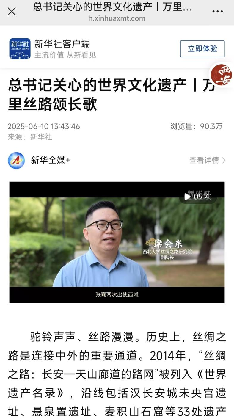 2025-07-05日前,新华社客户端等平台播发“总书记关心的世界文化遗产:万里丝路颂长歌”专题片,我院副院长席会东接受新华社访谈内容在专题片中播出。席会东在新华社的访谈中,主要讲述了丝绸之路的概念和内涵,梳理了丝绸之路的发展阶段和主要路线,强调了汉代张骞两次出使西域,推动丝绸之路实现全线贯通、并由民间商道跃升为国际外交官道、文明交往之路的重要意义,揭示了周秦汉唐时期陕西对丝绸形成、发展、繁荣的重大贡献,阐述了丝...