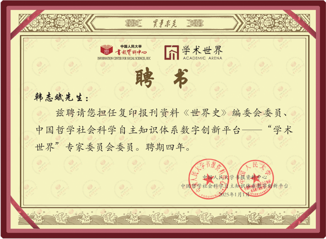 2025-06-10yl6809永利官网集团院长韩志斌教授受邀担任复印报刊资料《世界史》编委会委员、中国哲学社会科学自主知识体系数字创新平台——“学术世界”专家委员会委员